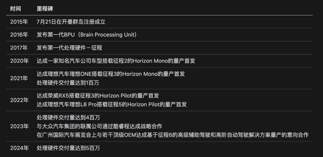 数据来自地平线招股书 除了汽车处分决策外,地平线还提供非车处分决策,主要为拓荒制造商提供智能化决策,举例割草机、扫地机器东谈主等拓荒。 据了解,地平线不仅是中国最大的自动驾驶芯片供应商,亦然最大的家庭处事机器东谈主的芯片供应商,波及到的居品包括科沃斯扫地机器东谈主、海信健身聪敏屏、小度添添智能健身镜等。 干系词,尽管非车处分决策业务远景可以,但并非地平线的战术重心。 招股书露出,该部分业务在 2021 年至 2023 年的收入分歧为 0.57 亿元、1.05 亿元和 0.81 亿元,收入占比逐年下落,分歧为 12.1%、11.5% 和 5.2%。 5、中枢工夫 地平线的中枢工夫上风体目下芯片瞎想、算法开发和软硬件归并三个方面。 地平线的高档辅助驾驶和高阶自动驾驶处分决策则基于全面的工夫栈,包括用于驾驶功能的算法、底层处理硬件,以及促进软件开发和定制的多样器用。 • 算法。算法专诚为鄙俚驾驶场景而构建和优化,全地方算法能力涵盖感知、环境建模、谋划及限度以及驾驶功能,大略骄气各个层面的高档辅助驾驶和高阶自动驾驶处分决策的开发条目。 ![]() • BPU。BPU是专诚为汽车哄骗(包括高档辅助驾驶和高阶自动驾驶功能)量身定制的私有处理架构,使处理硬件在运行算法时具有出色的性能、高能效和低蔓延。 • 地平线天工开物。地平线天工开物是算法开发器用链,包含一系列即用型模块和参考算法,使得用户大略在地平线处理硬件上准确高效地部署算法和软件。 • 地平线踏歌。一套面向高阶自动驾驶的安全、简易且易于使用的镶嵌式中间件。地平线踏歌提供模范化车规级处事和器用,以匡助加速开发、集成和考据责任,从而大幅推进和加速量产进度。 • 地平线艾迪。软件开发平台,旨在高效完成模子的自动迭代更正。通过提供多样器用和哄骗要领界面以及简化的责任经由,AIDI艾迪能匡助软件开发东谈主员优化从部署、检修、考据、评估到迭代的整个这个词软件开发经由。 6、估值及融资情况 地平线自建树以来共完成多轮融资,累计融资金额进步34亿好意思元。 在递交招股书之前,地平线临了一轮融资为2022年9月裸露的奇瑞汽车的战术投资,投后估值约87.1亿好意思元(约615亿东谈主民币)。 主要融资情况如下: ![]() 融资数据来自36kr 2024年3月,地平线认真向港交所递交招股书。 2024年10月8日,地平线认真通过港交所聆讯,行将踏入港股阛阓。高盛、 摩根士丹利和中信建投海外担任联席保荐东谈主。 6、财务情况 从财务说明来看,地平线频年来呈现出高速增长态势。 公司营收从2021年的4.66亿元增长到2023年的15.51亿元,年复合增长率高达82.3%。 尽管收入快速增长,公司仍处于耗费状态。 2021 年至 2023 年,地平线的净耗费分歧为 20.64 亿元、87.2 亿元、67.39 亿元;经转机净耗费为 11.03 亿元、18.91 亿元、16.35 亿元,近三年耗费近 47 亿元。 地平线在招股书中讲明称,该公司的耗费主要来自于前期无数投资,范畴经济效应尚未开释,罗致权力法入账的分占投资功绩等原因。其谋略在翌日几年内通过扩大收入范畴、守护毛利率水平、普及筹备杠杆等情势已矣相差均衡和盈利。 数据露出,2023 年,地平线的用度支拨总额达到了 31.4 亿元,其中研发用度高达23.66亿元,占昔时营收的152.5%。 值得珍重的是,从 2021 年到 2023 年,地平线的毛利分歧为 3.31 亿元、6.27 亿元和 10.94 亿元,对应的毛利率分歧为 70.9%、69.3% 和 70.5%,接近英伟达 2023 年的 76%。 此外,限度2023年底,公司领有113.6亿元的现款及现款等价物,财务现象矜重。 凭据招股书裸露的数据,地平线频年来的主要财务洽商如下: ![]() 7、小结 总体而言,地平线算作中国起初的ADAS和AD处分决策供应商,在工夫研发和阛阓拓展方面取得了显贵进展。公司领有广宽的研发实力、完满的工夫栈、鄙俚的行业合作以及饱胀的资金辅助。 干系词,握续耗费、利害的阛阓竞争以及工夫迭代风险亦然公司靠近的主要挑战。 总体而言,地平线在中国自动驾驶芯片和处分决策阛阓占据要紧地位。跟着自动驾驶工夫的不断陶冶和阛阓范畴的扩大,地平线有望在翌日已矣盈利,并在民众智能驾驶界限说明更大作用。 - END -]article_adlist-->