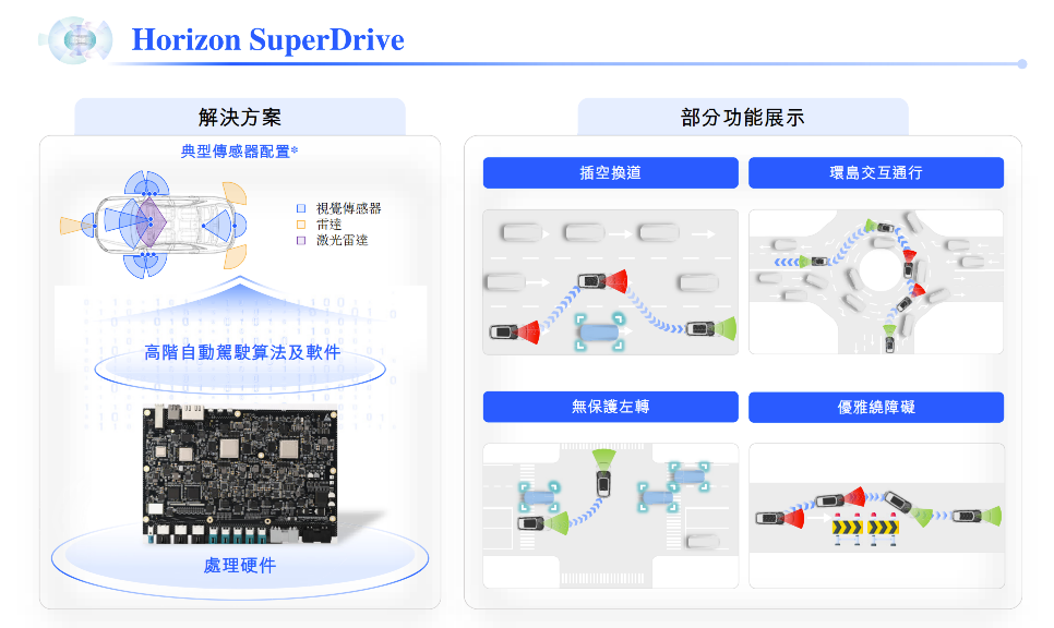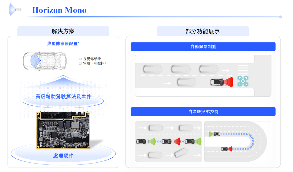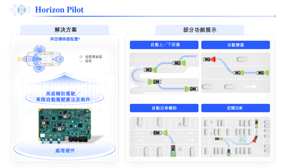 数据来自地平线招股书 4、业务 凭据招股书,地平线自我定位为乘用车高档辅助驾驶(ADAS)和高阶自动驾驶(AD)处分决策供应商,领有私有的软硬件工夫。 ![]() 处分决策整合了算法、专用的软件和处理硬件,为高档辅助和高阶自动驾驶提供中枢工夫,从而提高驾驶和乘坐的安全性和体验感。 地平线的业务主要分为两大板块:汽车业务和非汽车业务。 汽车业务方面,凭据客户的不同需求,地平线提供从L2到L4级别的、三种不同的ADAS和AD组合决策,包括Horizon Mono、Horizon Pilot和Horizon SuperDrive系列居品。 • Horizon Mono:主动安全高档辅助驾驶处分决策,旨在提高平方驾驶的安全性及首肯性,可已矣自动遑急制动(AEB)及智能大灯(IHB)等安全功能,亦可已矣自符合巡航限度(ACC)及交通拥挤辅助(TJA)等首肯功能。目下Horizon Mono上镶嵌的是征途2或征途3处理硬件。 ![]() • Horizon Pilot:高速自动领航(NOA)处分决策(归类为高阶自动驾驶处分决策)。除了增强的主动安全功能外,Horizon Pilot还能完成更高阶的驾驶任务,如自动上/下匝谈、交通拥挤时自动汇入/汇出、自动变谈、高速公路自动驾驶等。 同期,Horizon Pilot还提供泊车辅助功能,如自动泊车辅助系统(APA)及自动顾虑泊车(VPA)等功能。 ![]() 目下Horizon Pilot上镶嵌的是征途3或征途5处理硬件。到2023年年底,依然有进步25款车型搭载,比如期望L7到L9系列,王人选定了Horizon Pilot。 • Horizon SuperDrive:高阶自动驾驶处分决策,旨在于整个城市、高速公路和泊车场景中已矣指令和拟东谈主的自动驾驶功能。 ![]() 瞻望Horizon SuperDrive将大略应答多样复杂的谈路现象,罗致更积极和更具互动性的驾驶立场,已矣诸如优雅避障、拟东谈主的轻柔制动、动态速率限度、沉稳的无保护左转等功能。Horizon SuperDrive谋略将镶嵌最新的征途6处理硬件。 目下,地平线通过软硬一体处分决策,依然赢得27家OEM罗致,装载了进步285款车型;中国十大OEM王人选定了地平线的处分决策,以用于车型量产。